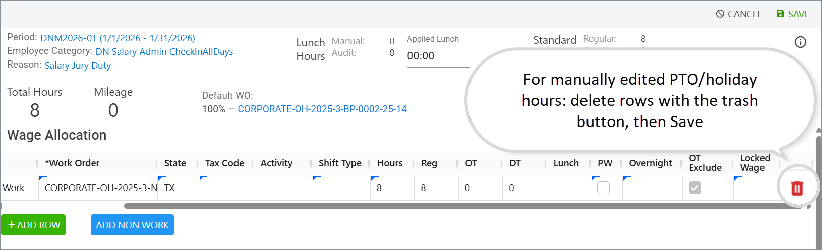 - For manually edited PTO/holiday hours: Click Edit on the table, delete rows with the trash button, then Save.