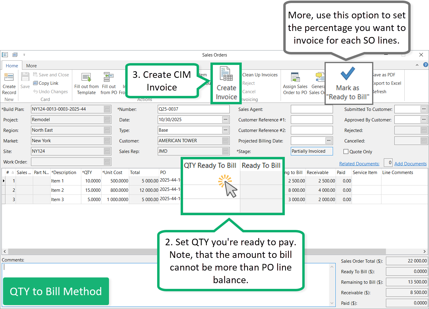 - Based on the entered quantity to bill (QTY Ready To Bill)