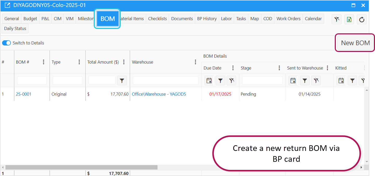 - In the Due Date field, specify when the BOM needs to be "Kitted" (picked and prepped for crew pickup).
