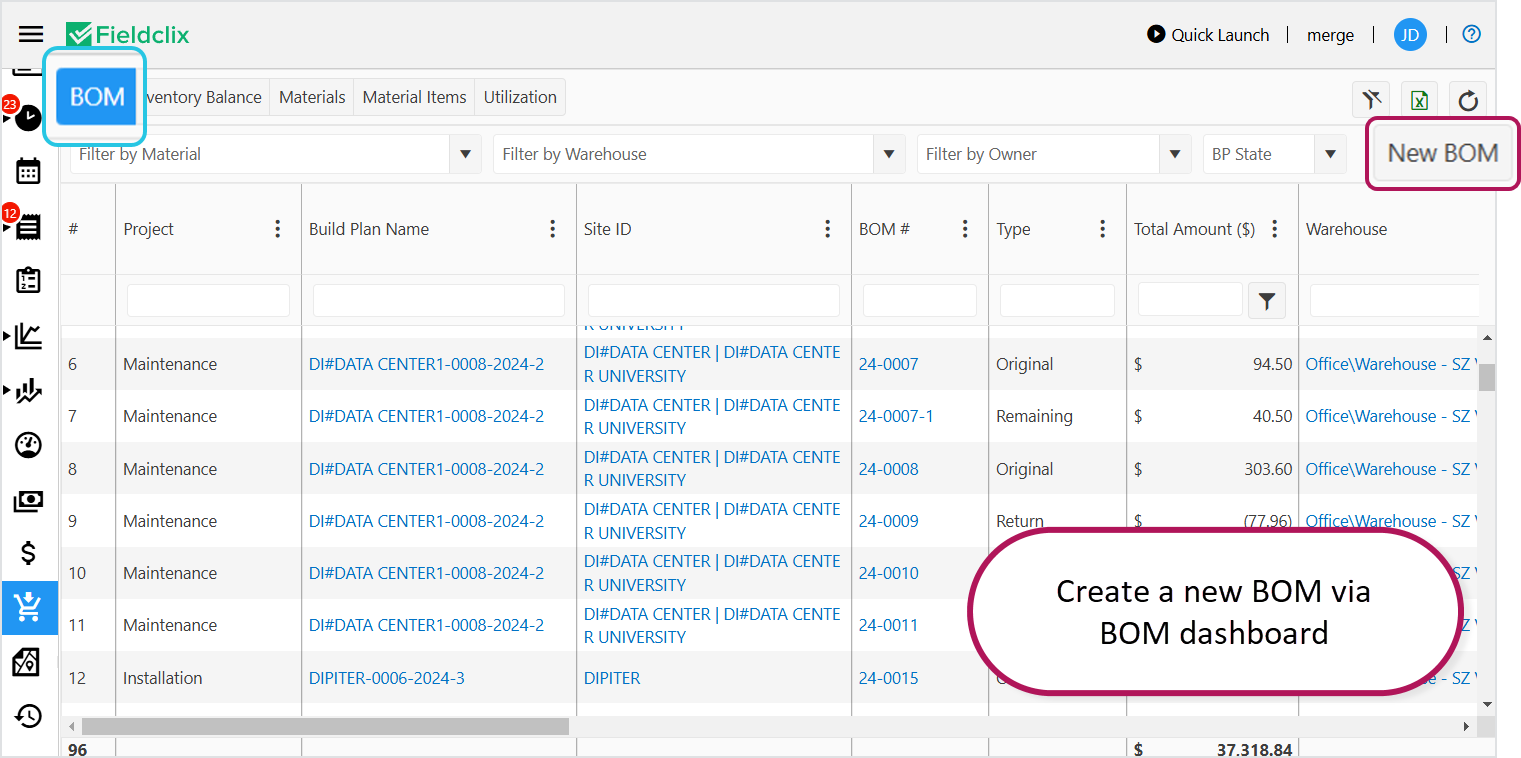 - Navigate to the BOM tab in the Build Plan or use the Bill of Materials dashboard.