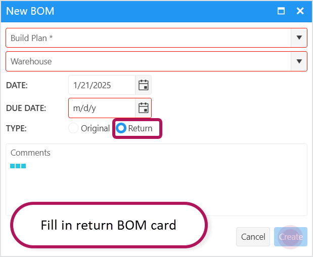 - Select the "Return BOM" type. Warehouse Managers and Administrators can choose between Original or Return BOM types, while other users can only create an Original BOM.