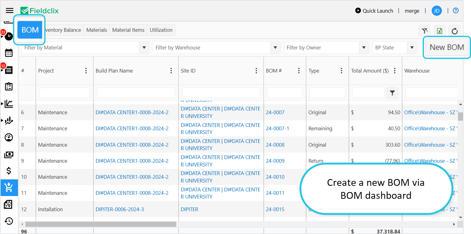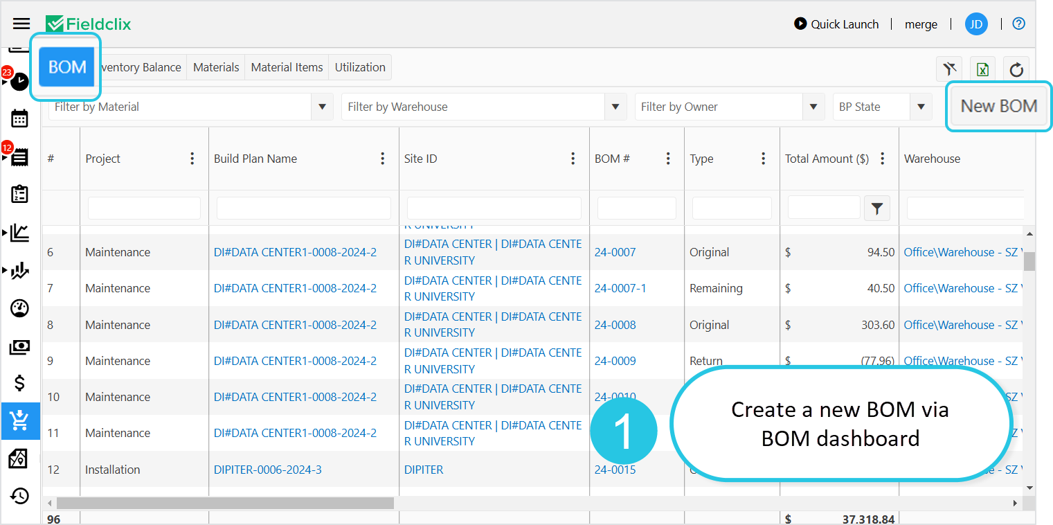 1. In the BOM dashboard, click the New BOM button.