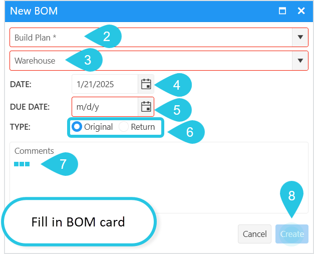 6. Select BOM type. Warehouse Managers (employee role) and Administrators can select what type of BOM to create: original or return, while other users can generate only an original BOM.