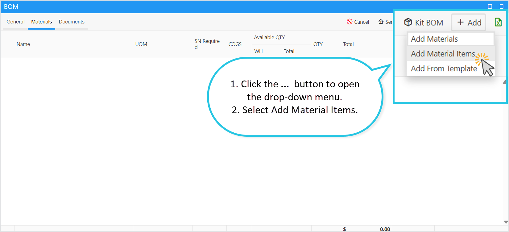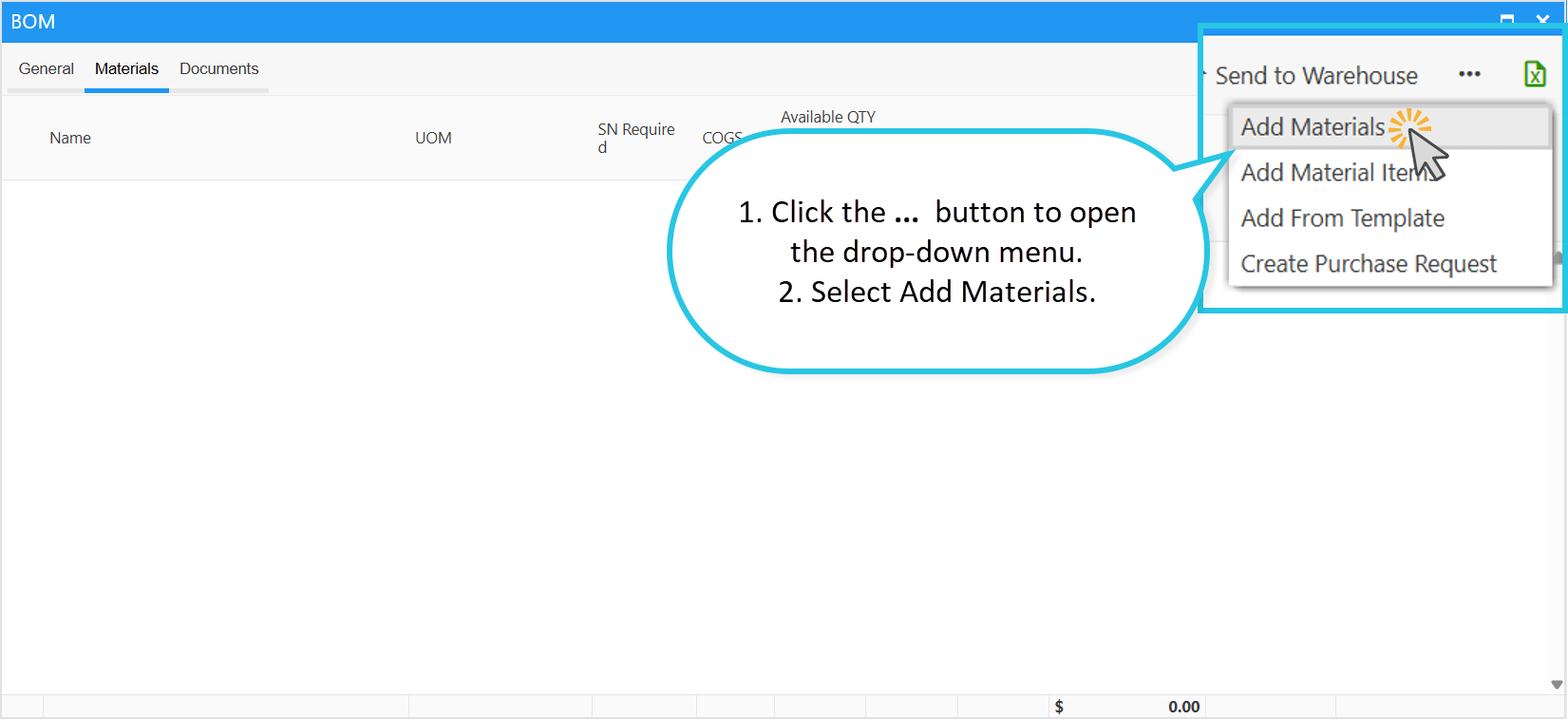 To add materials to the Bill of Materials (BOM), follow these steps: