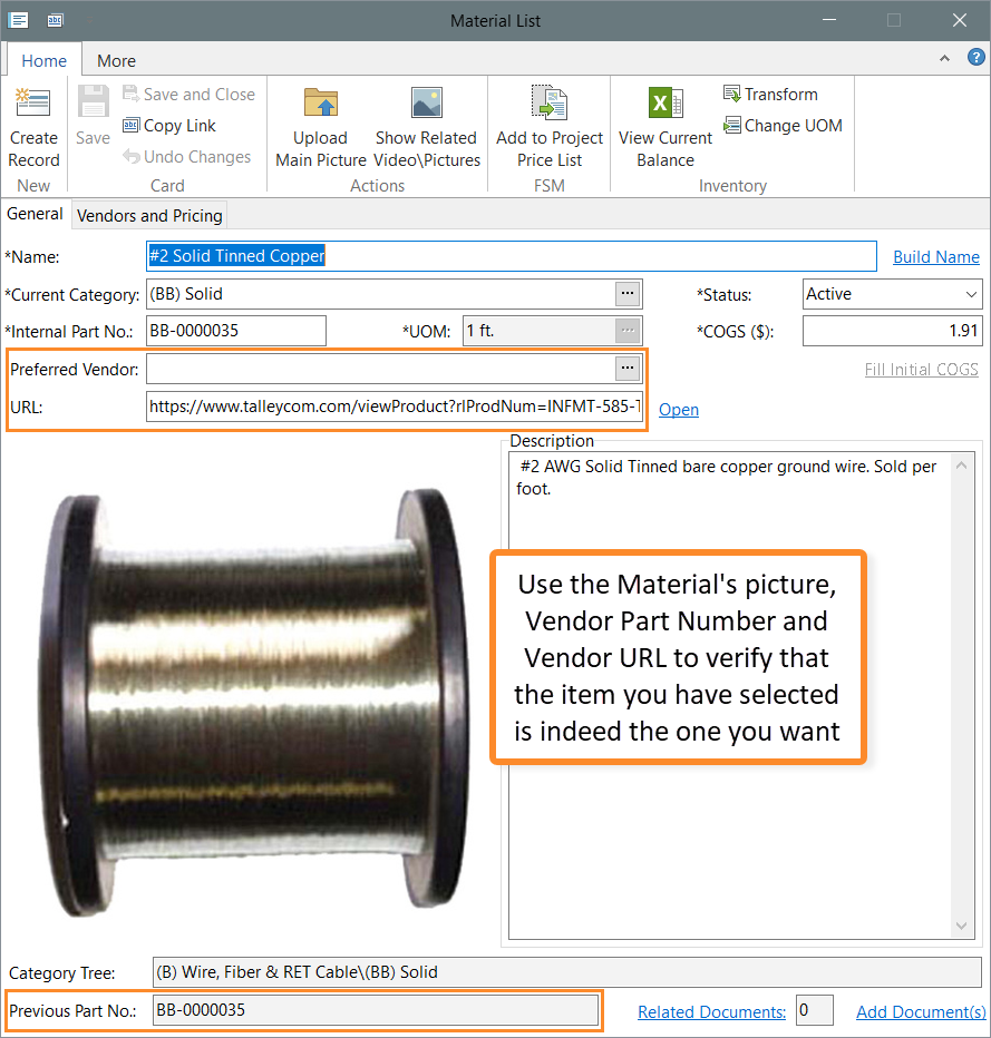 - Check the material’s image, Vendor Part Number, and Vendor URL on the Material List Item Card.