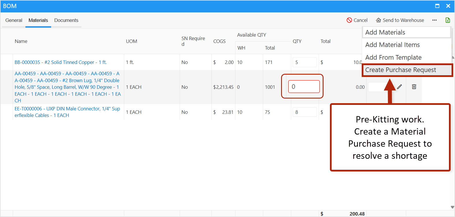 - Send BOM to Warehouse