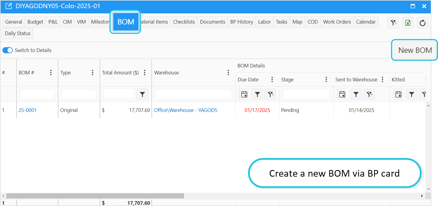 - For the accessible Build Plans, users can also access the BOM tab within the Build Plan card.