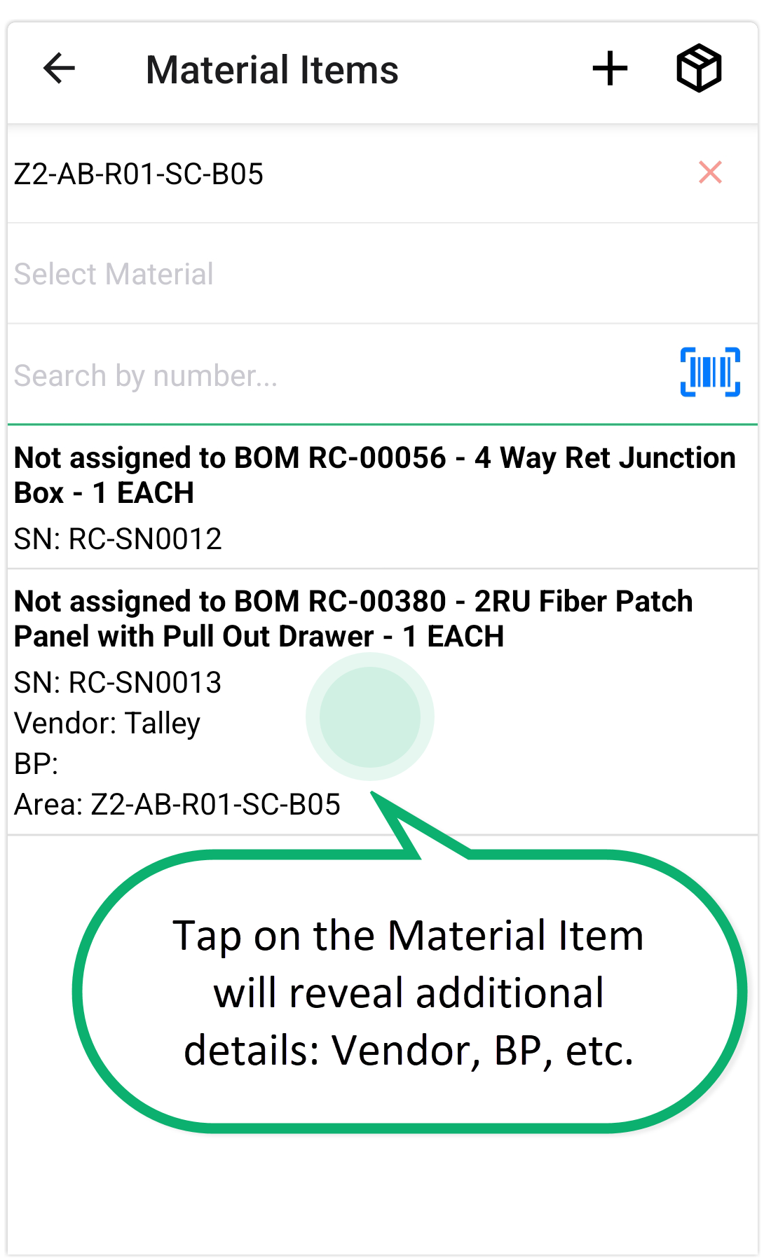 - Tapping on any Material Item will reveal additional details such as the Vendor and related Build Plan assignments.