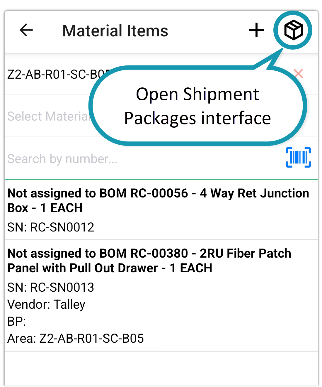 On the Material Items screen, tap the box icon at the top-right corner to open the Shipment Packages screen. For a detailed overview, please refer to the dedicated article on Shipment Packages.
