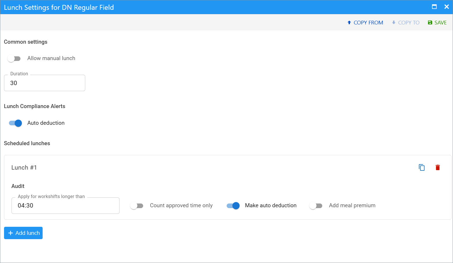 In the Scheduled Lunches section, click + Add Lunch to define expected lunch times, default duration, notifications, etc.