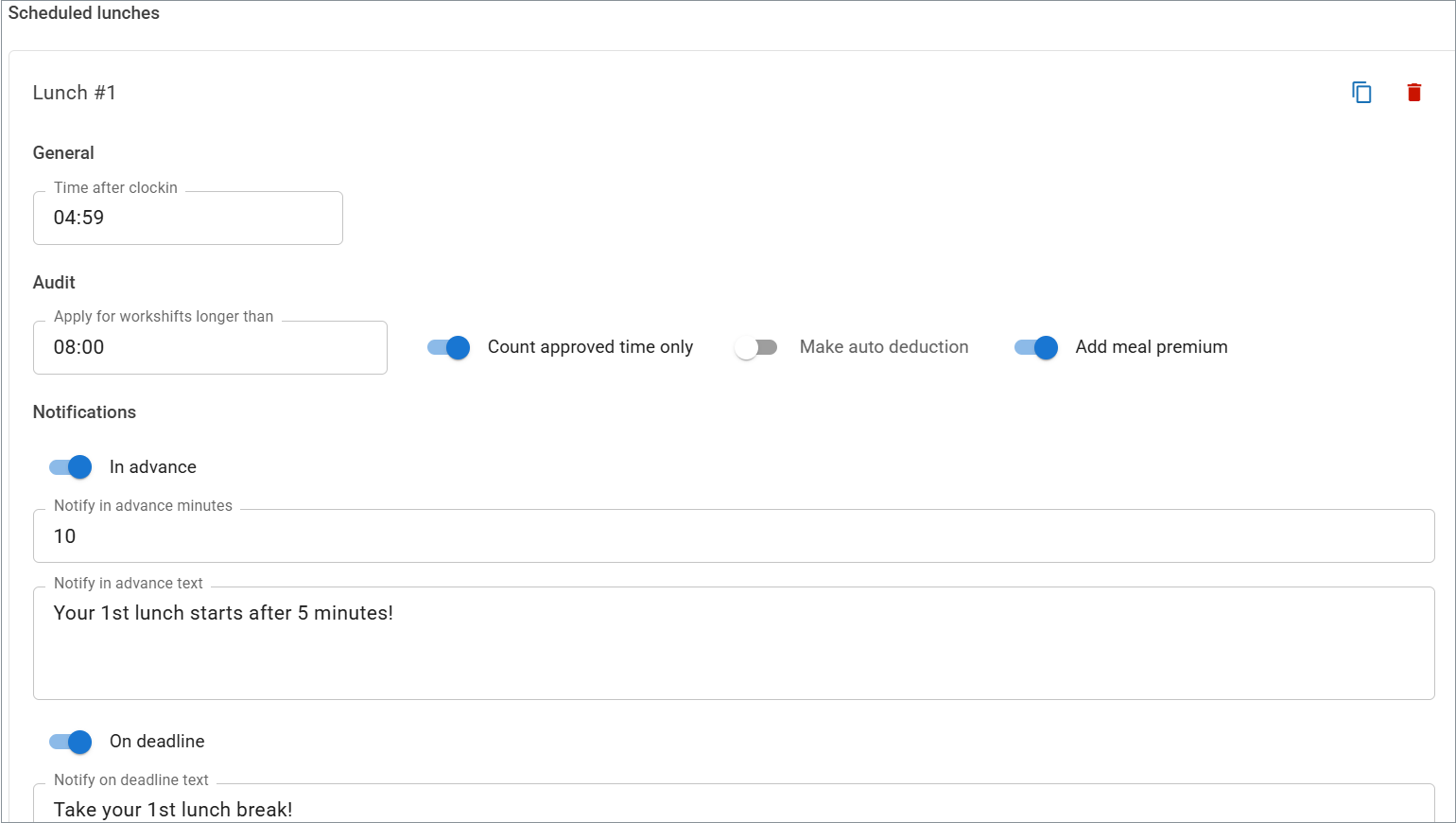 - Apply for workshifts longer than (hh:mm) – Only shifts exceeding this length are audited for meal compliance.